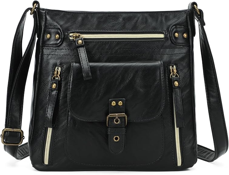 This crossbody bag is a study in functional edge, featuring a supple black leather exterior with a slightly distressed finish that gives it immediate character. The design is defined by its organized, multi-compartment front, which includes two vertical zippered pockets and a central flap pocket secured by a classic brass-toned buckle. These utility-inspired details are complemented by exposed gold-tone zippers and matching rivet accents, blending a rugged aesthetic with high-fashion hardware.