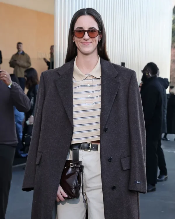 Caitlin Clark’s long brown coat is the ultimate statement of refined minimalism. Designed with a structured silhouette and sharp lapels, the piece delivers a timeless menswear-inspired edge while maintaining an effortlessly chic appeal. The rich chocolate tone enhances its versatility, making it perfect for layering over both casual and elevated looks. Its clean lines, double-button closure, and relaxed drape create a polished outerwear moment that feels both powerful and sophisticated — a standout choice for Milan Fashion Week.