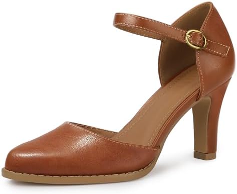 Combining vintage charm with contemporary comfort, these pointed-toe pumps are rendered in a rich cognac leather. The design is defined by its elegant d’Orsay-style cutout and a delicate ankle strap fastened with a burnished gold-tone buckle. Supported by a sensible yet stylish stiletto heel, these shoes provide a graceful lift, making them an ideal choice for a long day of runway shows and evening presentations alike.
