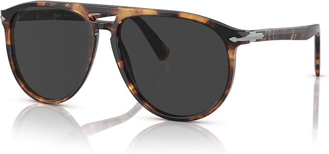 These Persol aviator-style sunglasses feature a distinctive tortoiseshell frame with a rich blend of amber and dark brown tones. The design is characterized by a bold double bridge and large, teardrop-shaped dark grey lenses that offer a classic, retro-inspired aesthetic. A signature silver “Supreme Arrow” hinge detail connects the front frame to the tapered temples, while the flexible Meflecto system is visible on the arms, ensuring a comfortable, custom fit.