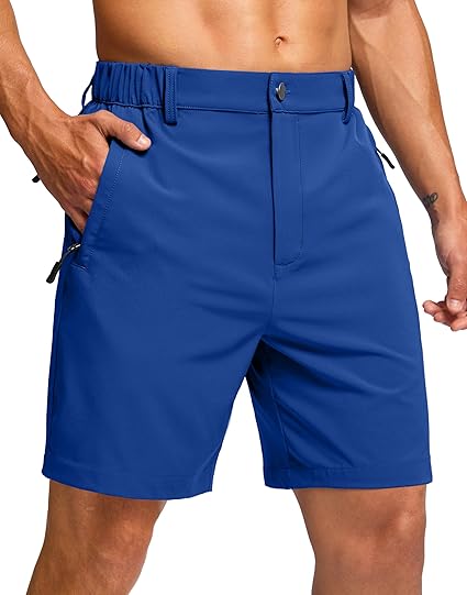 These vibrant royal blue performance shorts are designed for a blend of utility and comfort, featuring a hybrid waistband with an elasticated back and standard belt loops for a secure fit. The design includes a classic button closure and a hidden fly, complemented by zippered side pockets that offer secure storage for essentials during active use. Made from a smooth, lightweight technical fabric, these shorts offer a streamlined, modern silhouette that transitions easily from hiking trails to casual everyday wear.
