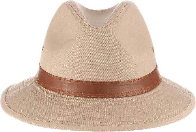 This classic tan safari hat is crafted from a durable cotton twill, featuring a structured fedora-style crown with a distinct centre crease. The design includes a medium-width, down-sloping brim reinforced with multi-row stitching for added stability and sun protection. Accented by a contrasting brown leather-look band around the base of the crown and small metallic ventilation eyelets on the sides, this headwear combines a rugged, adventurous aesthetic with practical breathability for outdoor use.
