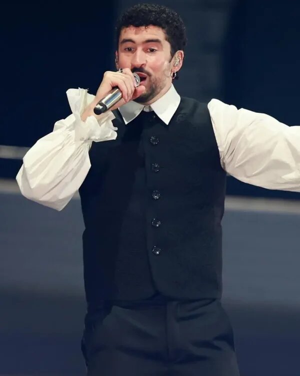 Layered over the shirt was a sleek black vest that elevated the entire ensemble. The vest introduced a formal and polished element while still fitting perfectly with Bad Bunny’s modern stage persona. Its structured silhouette helped define the outfit and added depth to the overall look. This layering choice demonstrated how a simple vest can transform a classic outfit into a stylish stage-ready ensemble.