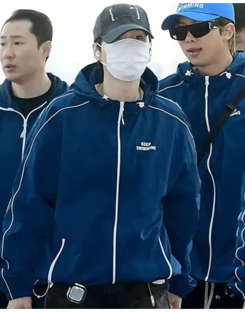 The centerpiece of this look is the deep navy windbreaker, a piece that perfectly balances functional athletic wear with BTS’s signature aesthetic. Featuring a crisp “KEEP SWIMMING” logo on the chest and contrasting white piping along the sleeves, this jacket is designed for movement. The lightweight, water-resistant fabric makes it an ideal layer for transitional weather, while the hooded silhouette mirrors the effortless “airport style” the members are famous for. It’s a versatile statement piece that speaks to resilience without saying a word.