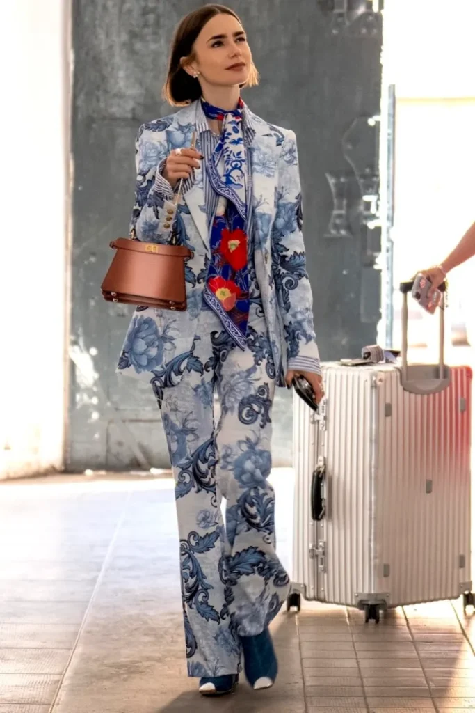 These elegant Olivia blue pants, inspired by Lily Collins’ standout style in Emily in Paris, feature a striking floral pattern and tailored silhouette that exude modern Parisian sophistication. Perfect for creating polished daytime looks or chic travel outfits, they add a bold yet graceful touch to any fashion-forward wardrobe.