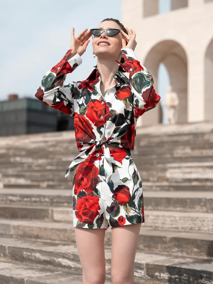 This elegant red rose print shirt, inspired by the look worn by Lily Collins in Emily in Paris, captures romantic Parisian charm with a bold, fashion-forward edge. Designed with a striking floral pattern, crisp button-down style, and a flattering tie-front detail, it’s perfect for creating chic daytime or statement evening outfits. Pair it with skirts, shorts, or tailored pants for an effortlessly stylish look.