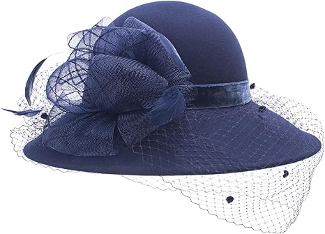 A coordinated wide-brimmed felt saucer hat in deep navy. It is intricately detailed with a tonal mesh veil and an architectural silk-organza bow on the side, adding a layer of traditional British millinery flair to the modern coat dress.
