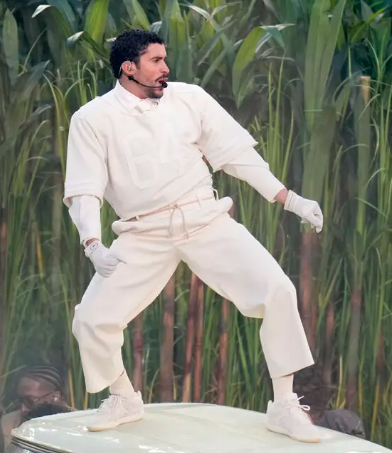 Moving away from traditional high-fashion couture, Bad Bunny opted for a custom, cream-toned ensemble by Zara that balanced athletic sensibility with a deep narrative. From his “OCASIO 64” jersey—a heartfelt tribute to his late uncle—to his signature Adidas BadBo sneakers, every element of the look was meticulously chosen to reflect his roots and identity on one of the world’s biggest stages.