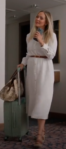 The white shirt dress featured in Missing the Boat (2026) showcases effortless travel fashion with a timeless appeal. Designed in a classic button-down silhouette, this look combines comfort and elegance, making it ideal for summer travel and vacation wear.