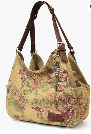 This floral canvas handbag adds a timeless, travel-ready charm to any outfit with its vintage-inspired tapestry print and rich leather straps. Designed with a roomy interior and a relaxed silhouette, it’s both practical and stylish—perfect for everyday wear, vacations, or movie-inspired looks. The soft floral detailing paired with sturdy craftsmanship makes this handbag a versatile accessory that effortlessly elevates casual and chic ensembles alike.